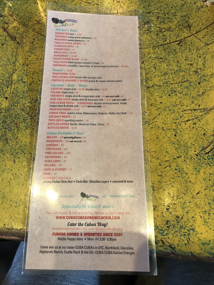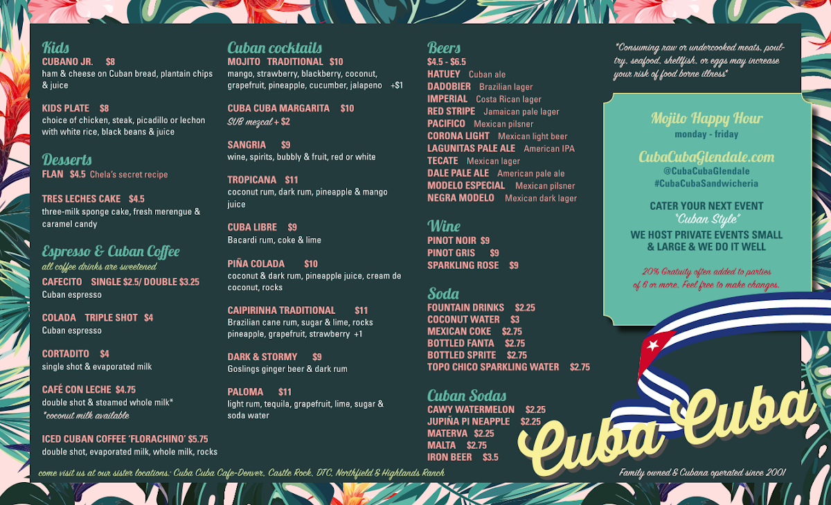 Step into Cuba Cuba Glendale, where vibrant Cuban flavors come alive in every dish. Whether you're here to enjoy a lively lunch or a relaxing dinner, the menu is a celebration of traditional Cuban dishes with a modern twist. From savory appetizers to mouthwatering entrées, each item is crafted with care and full of authentic, bold flavors. The Cuba Cuba Glendale Menu features a variety of options, from classic Cuban sandwiches to perfectly spiced meats and seafood, all complemented by fresh ingredients. With an inviting atmosphere, the menu offers something for everyone, making it the perfect spot to savor Cuban cuisine.